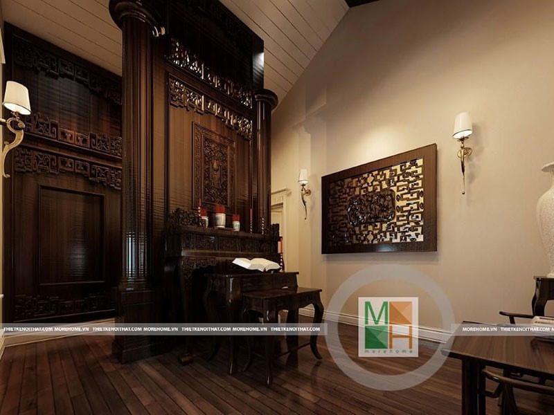 Không gian phòng thờ với nội thất gỗ tự nhiên màu trầm sang trọng tạo không gian yên tĩnh và linh thiêng nhất