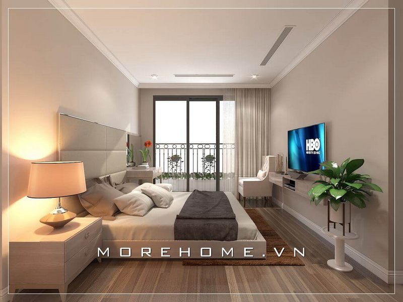 Trang trí nội thất phòng ngủ Master chung cư hiện đại, cửa sổ hướng ra ban công được thiết kế với kích thước lớn với kính cường lực tạo cho căn phòng thêm thoáng đãng hơn