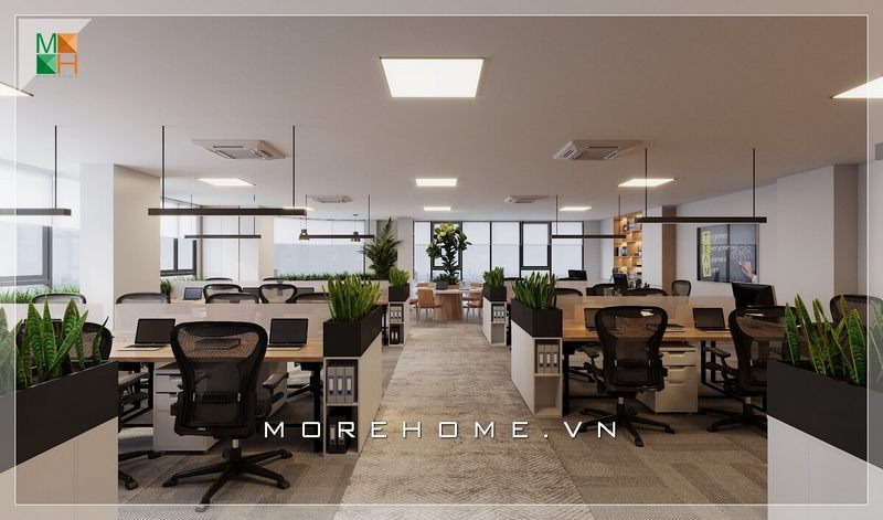 Không gian làm việc mở không chỉ giúp tạo cảm giác thoải mái, mà còn khuyến khích sự giao tiếp giữa các nhân viên, từ đó nâng cao khả năng hợp tác và sáng tạo. Kế hoạch sắp xếp bàn làm việc theo nhóm, với cây xanh trang trí xung quanh, có thể tạo ra một môi trường thân thiện và sinh động.
